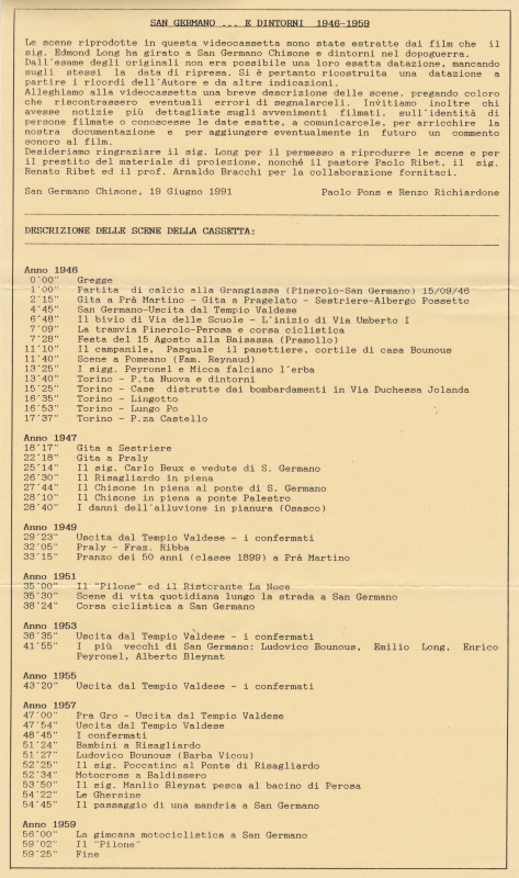 Le scene presenti nel video sono un estratto della videocassetta (vedi contenuto) intitolata "San Germano... e dintorni 1946-1959" realizzata il 19 Giugno 1991 da Paolo Pons, Renzo Richiardone con la collaborazione del pastore Paolo Ribet, il sig. Renato Ribet ed il prof. Arnaldo Bracchi. Le immagini sono parte delle riprese 8mm che il sig. Edmond Long ha girato a San Germano Chisone e dintorni nel dopoguerra.